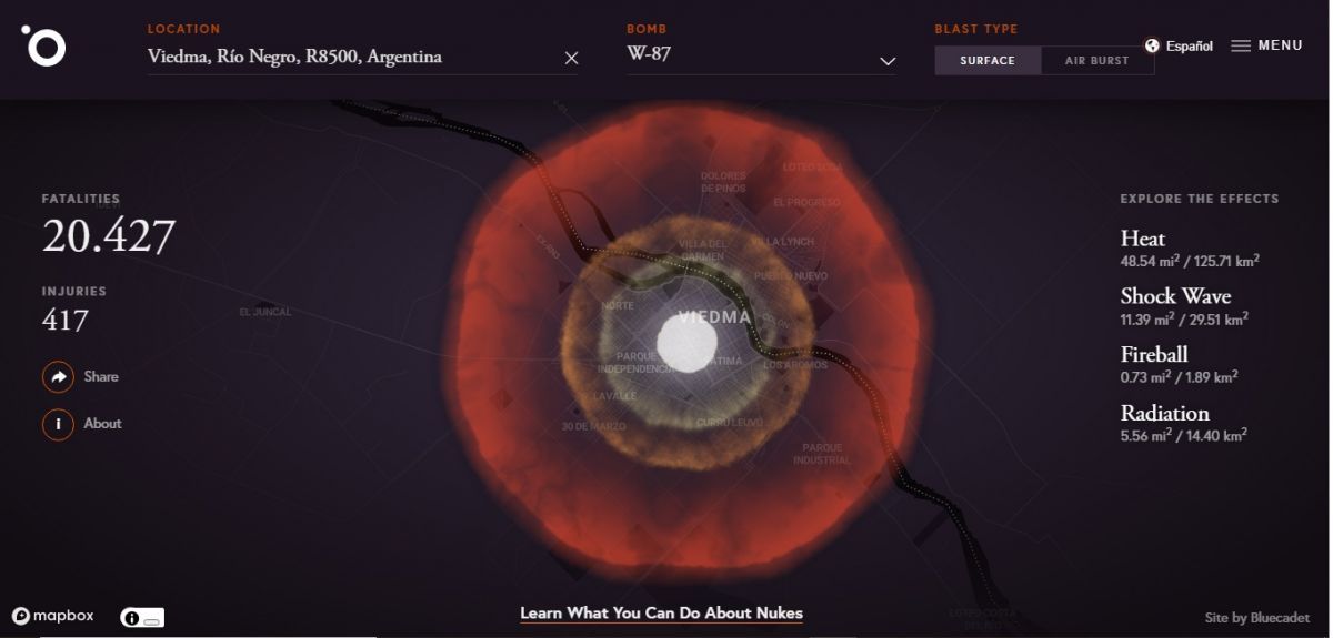 El 20 por ciento de la población de Viedma; es decir, un poco más de 20 mil personas morirían de existir un atentado con una bomba nuclear. Así lo determinó el sitio Science Alert, que creó una aplicación que mide el impacto de estos ataques según la localización de cada uno.