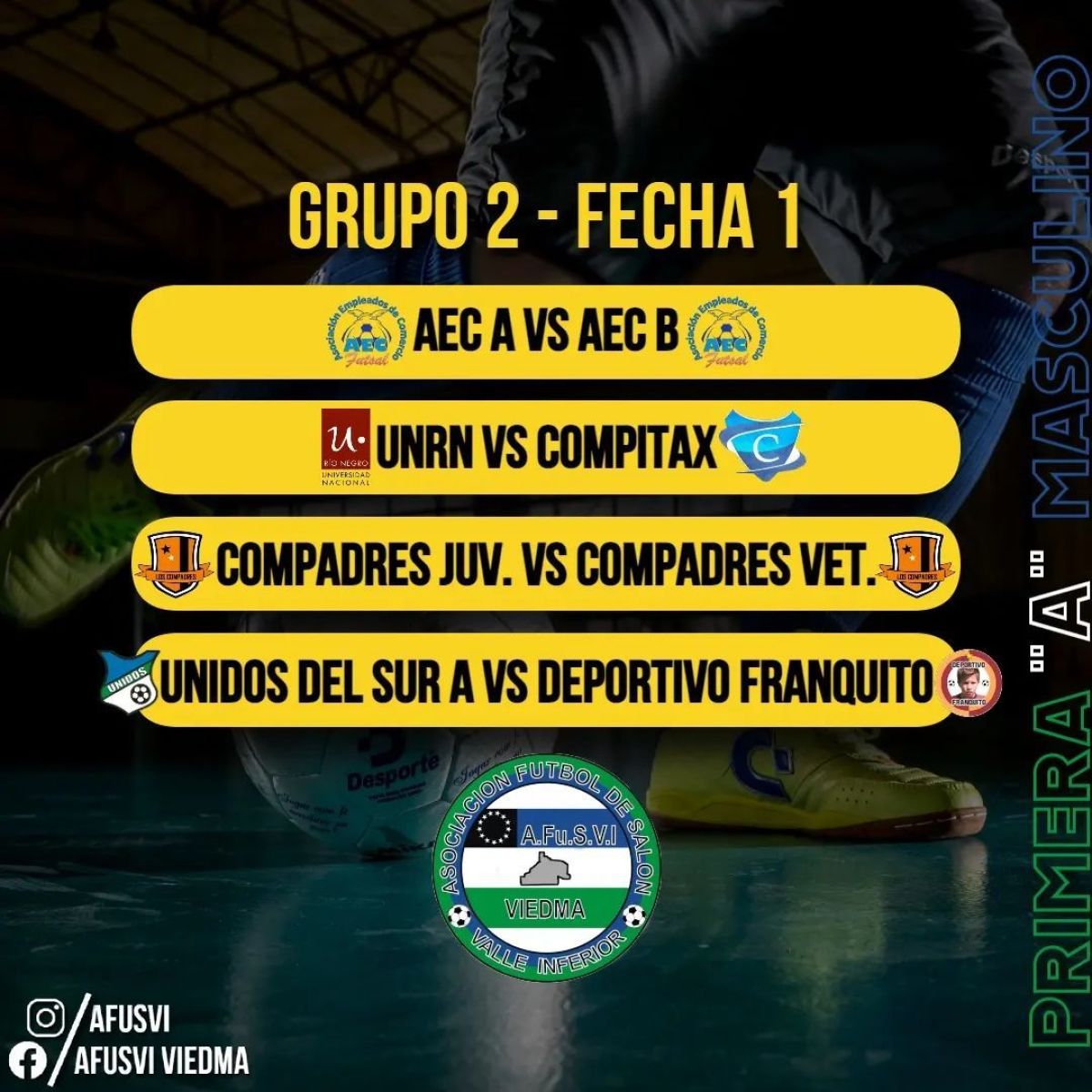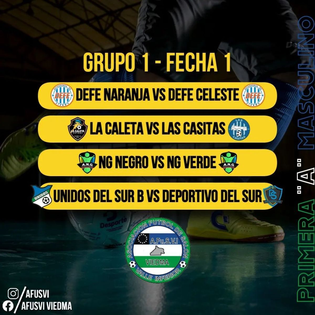 La Asociación de Fútbol de Salón Valle Inferior (Afusvi) confirmó los grupos y el fixture del campeonato masculino de Primera División que dará comienzo este fin de semana en el gimnasio Anexo del Polidepotivo Ángel Cayetano Arias.