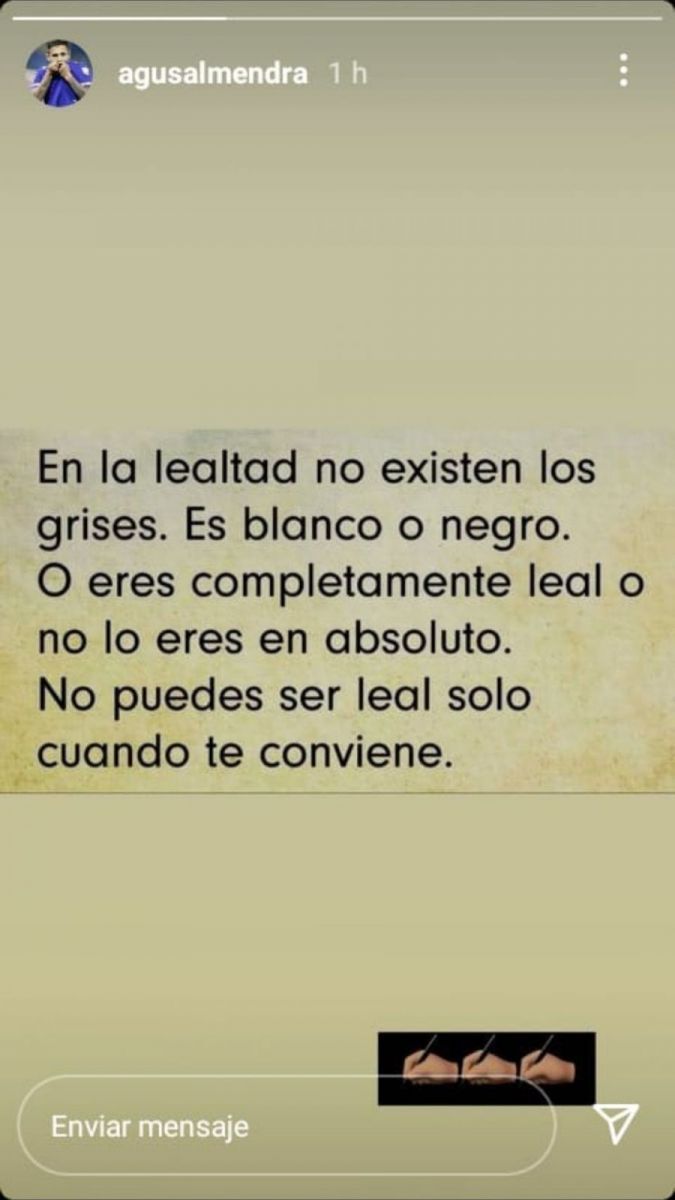 En una historia de Instagram, Almendra compartió un fragmento de un texto, en el que reflexiona sobre el significado de la palabra que casualmente Benedetto tiene tatuada: "En la lealtad no existen los grises. Es blanco o negro. O eres completamente leal o no lo eres en absoluto. No puedes ser leal solo cuando te conviene", reza el posteo del juvenil.