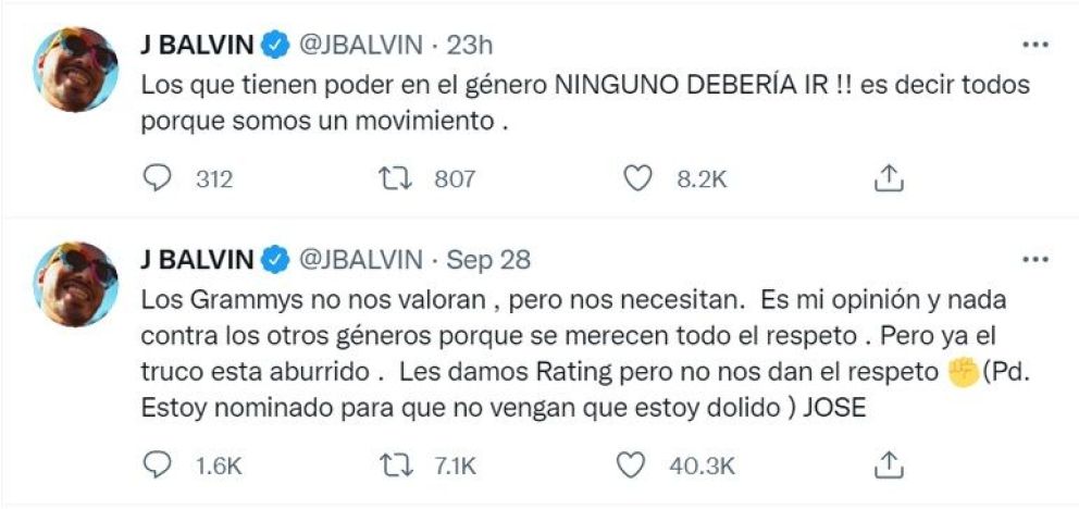 El conflicto se remonta a finales de 2021, más específicamente en las nominaciones de los Latin Grammys de ese año. J Balvin intentó boicotear el evento, pues según él se aprovechaban del género urbano, pero no lo reconocían como corresponde.