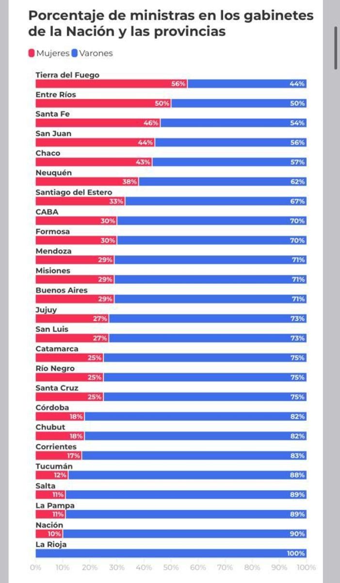 A nivel provincial, se cuenta con un 25% de ministras mujeres, el mismo porcentaje que Catamarca y Santa Cruz. En el otro extremo se encuentran La Rioja, donde no hay ministras provinciales, y La Pampa y Salta, con 11% en ambos casos.