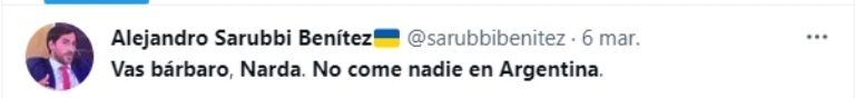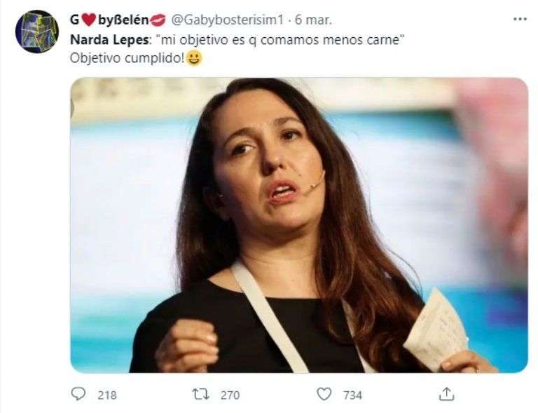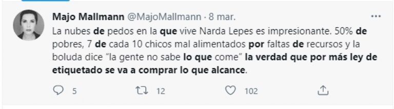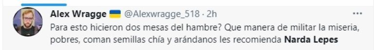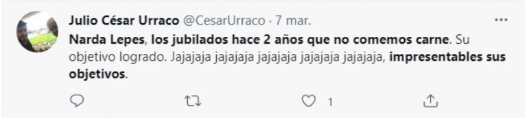 “La nube de pedos en la que vive Narda Lepes es impresionante. 50% de pobres, 7 de cada 10 chicos mal alimentados por faltas de recursos y ella dice: ‘La gente no sabe lo que come’. La verdad que por más ley de etiquetado se va a comprar lo que alcance”, escribió una usuaria. Mientras que otro le respondió: “Narda Lepes, los jubilados hace 2 años que no comemos carne. Su objetivo logrado. Jajaja