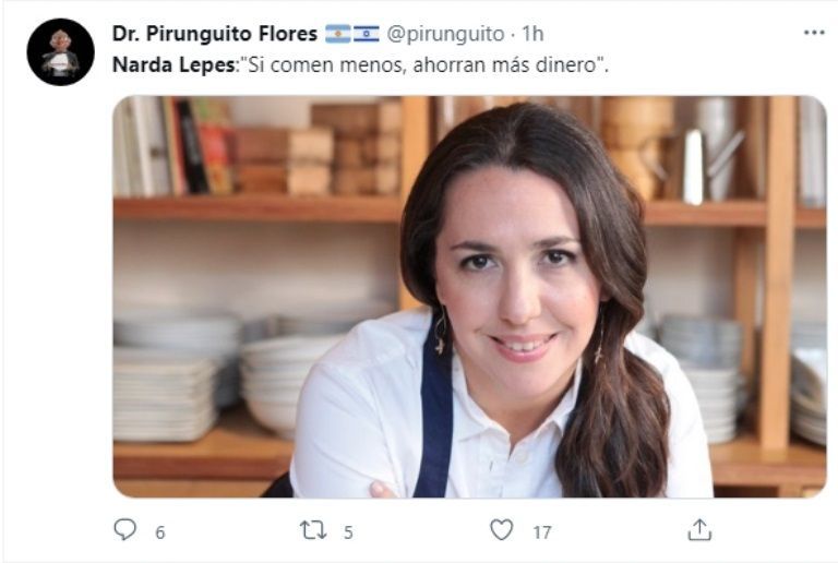 “Vas bárbaro, Narda. No come nadie en Argentina”, aseguró un usuario. “Objetivo cumplido el de Narda Lepes”, manifestó otra persona. “La inflación”, agregó otro que también publicó una imagen de la cocinera.