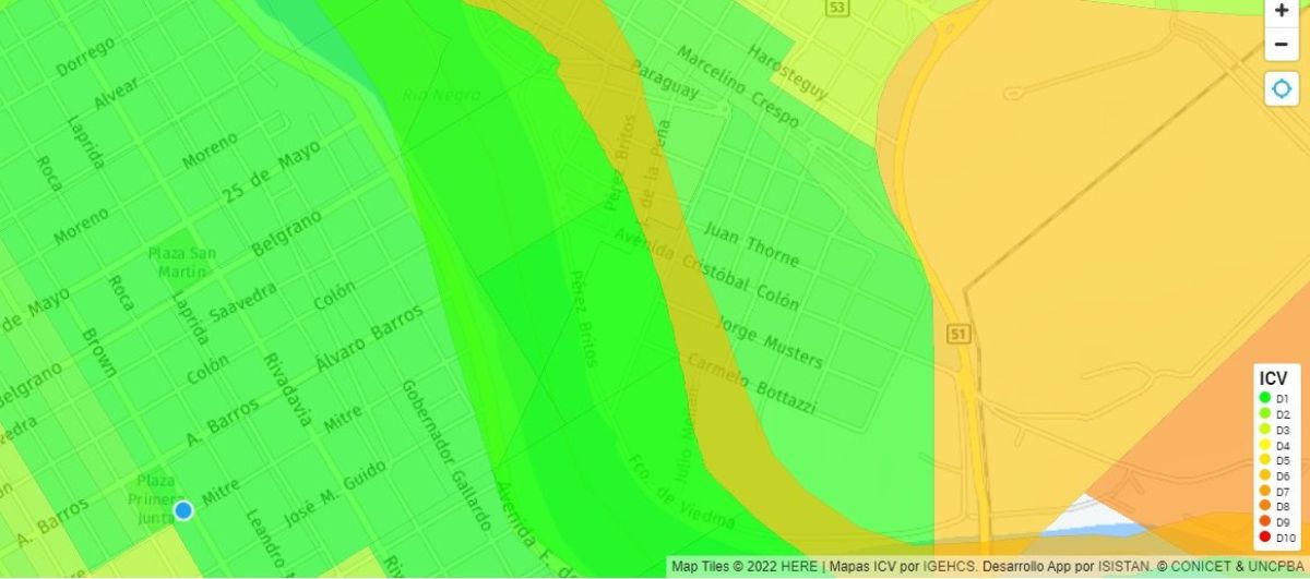 En Viedma, se puede observar que quienes viven en la zona céntrica y más cerca de la costanera tienen una buena calidad de vida (índice en color verde), mientras que en las calles más alejadas se sufren malas condiciones socioeconómicas (mapa en rojo).