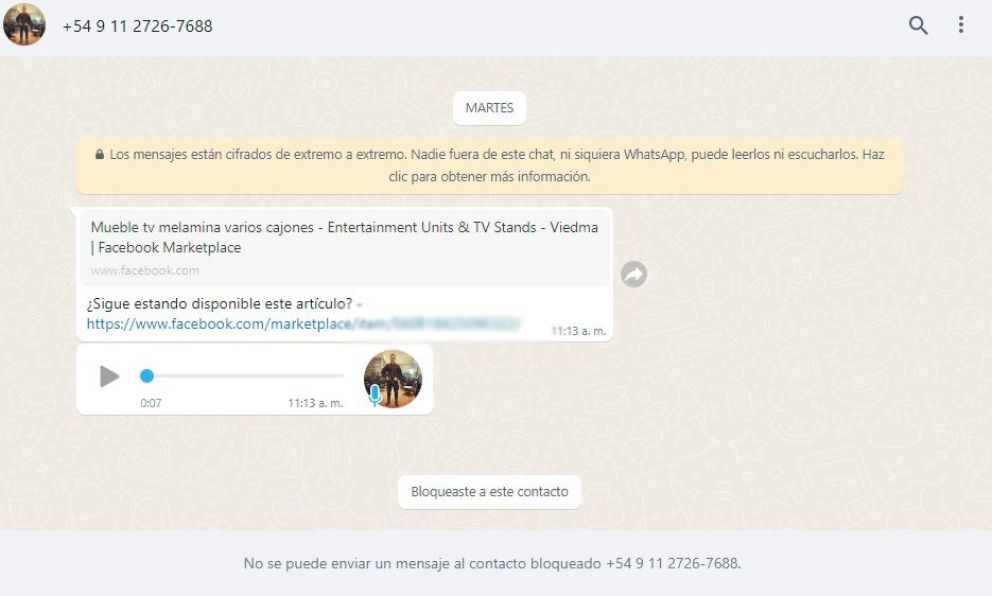 Mediante WhatsApp escriben: "¿Sigue estando disponible este artículo?" y luego comienzan con un "chamuyo" para entrar en confianza, mayormente a través de audios para evitar que quienes se den cuenta envien capturas de pantalla a modo de alerta.