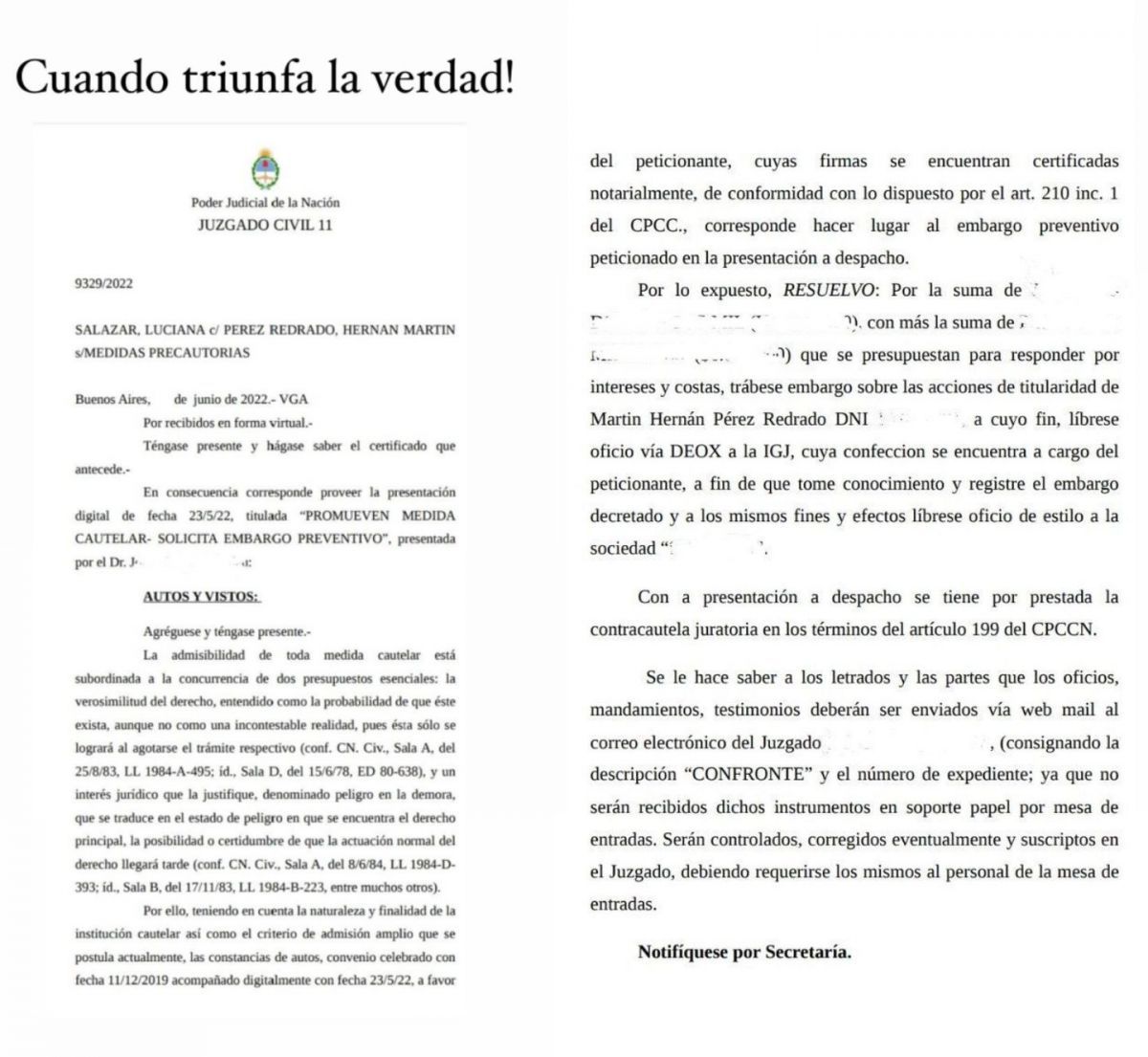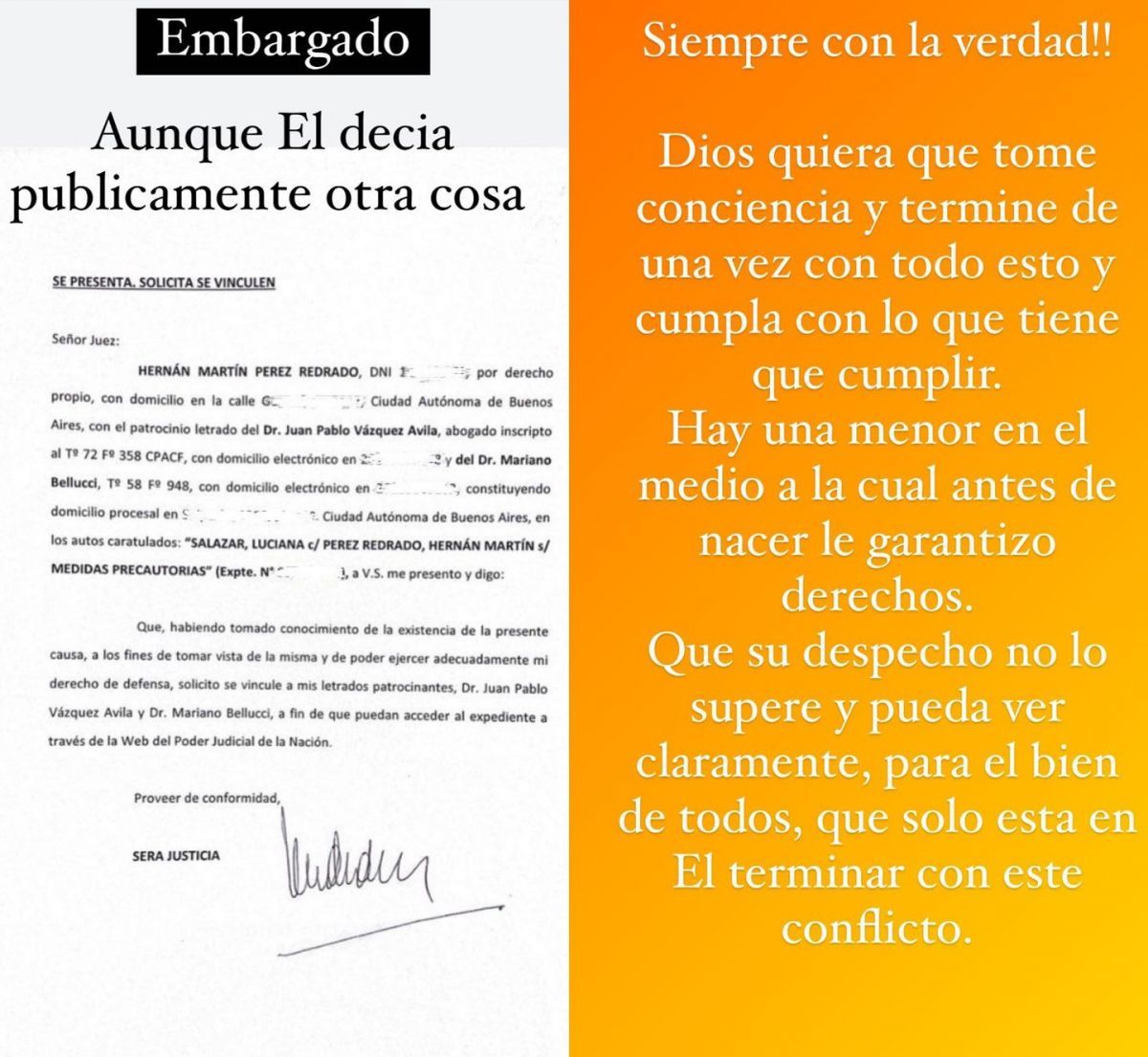 En este sentido, para dejar en claro que estaba diciendo la verdad, porque Redrado desmintió el proceso legal y aseguró que no había sido notificado de la demanda de Luciana Salazar, la mediática decidió compartir en sus redes sociales los documentos que la respaldan.