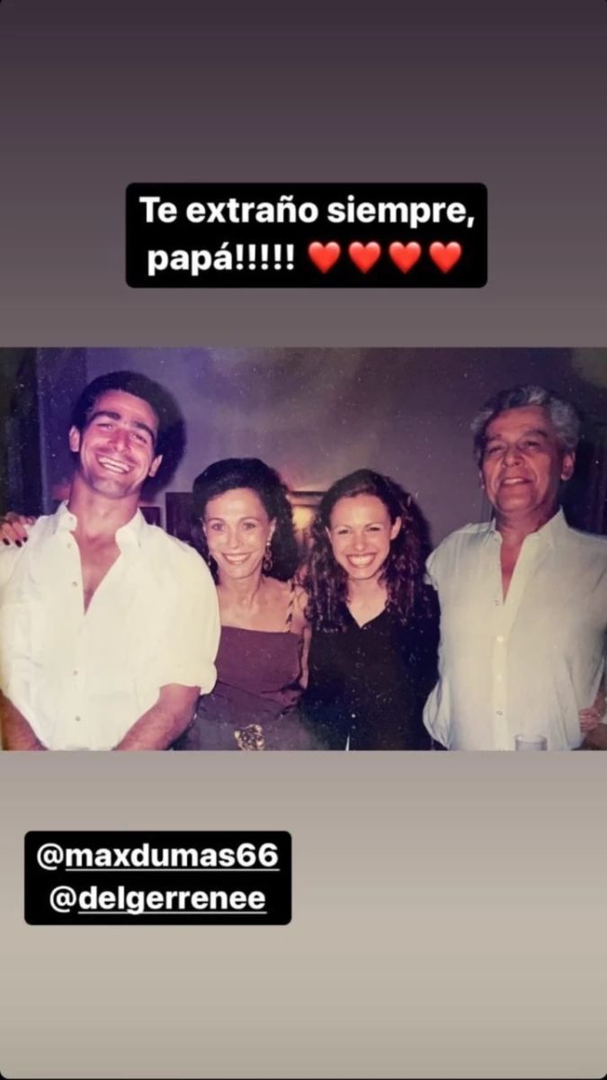 "Te extraño siempre, papá", señaló Denise encima de una foto en la que se la ve junto a su hermano Max Dumas, su mamá Renée Delger y su padre. Marcos sufrió esta enfermedad terminal y falleció en 1999, y eso le provocó una gran depresión a la artista.