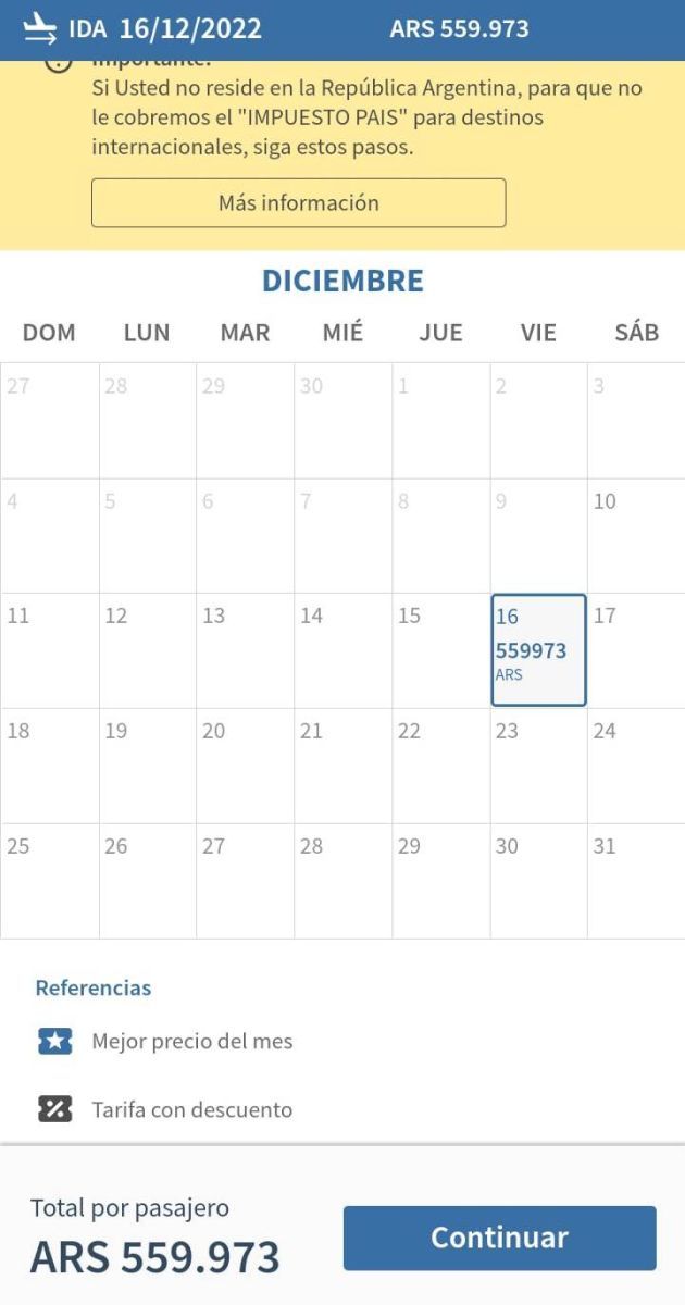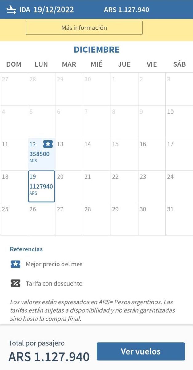 Este sábado 10, para las 9 de la mañana, ya no había posibilidad de reservar un lugar. ¿Sus valores? El que tuvo la suerte de ingresar a la página de la aerolínea de bandera pagó 458 mil pesos la ida y la vuelta 1.127.940. Una verdadera fortuna que no está al alcance de todos, claramente.