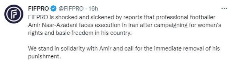 FIFPRO está conmocionada y asqueada por las informaciones de que el futbolista profesional Amir Nasr-Azadani se enfrenta a la ejecución en Irán después de hacer campaña por los derechos de las mujeres y las libertades básicas en su país. Nos solidarizamos con Amir y pedimos la eliminación inmediata de su castigo”, señaló el sindicato en un comunicado.