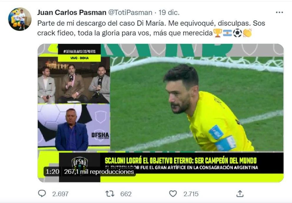 Ante este pedido de disculpas, el periodista subió a su cuenta de Twitter un video en el cual se muestra arrepentido: “Parte de mi descargo del caso Di María. Me equivoqué, disculpas. Sos crack fideo, toda la gloria para vos, más que merecida”.