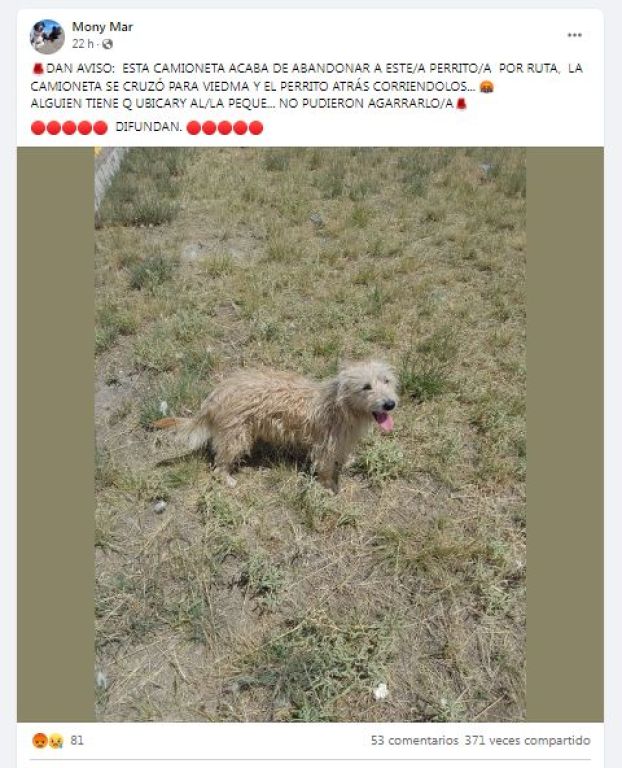 Una usuaria de Facebook compartió una publicación sobre el abandono de un perrito de raza chica. Según narra la primera versión, una camioneta lo dejó del lado de Patagones y cruzó hacia Viedma.