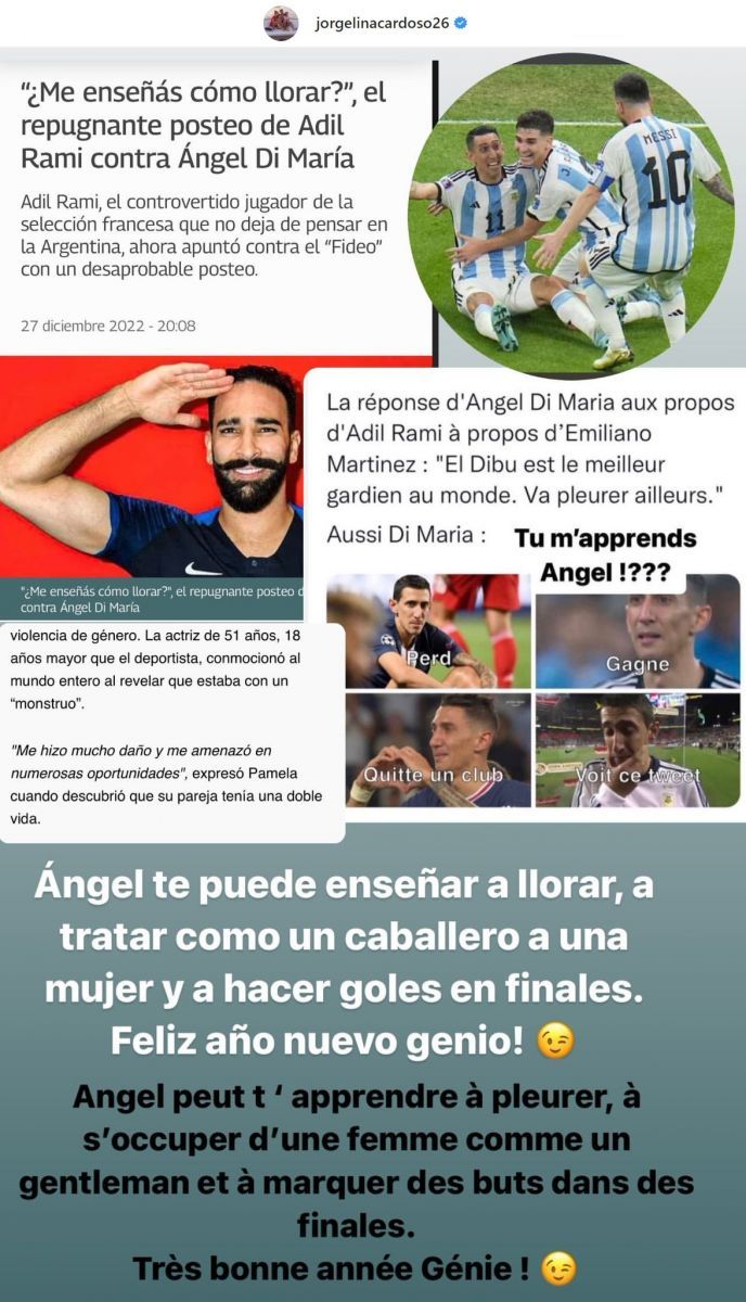 Lapidariamente, la madre de las dos hijas de Di María lo encaminó al francés: "Ángel te puede enseñar a llorar, a tratar como un caballero a una mujer y a hacer goles en las finales. Feliz año nuevo, genio", sentenció. Además compartió imágenes de noticias donde la actriz canadiense Pamela Anderson, ex pareja del jugador lo había calificado como un “monstruo” tras denunciarlo por violencia de género.  "Monstruo, sociópata y narcisista. Cuando me aplastó las manos, especialmente la derecha, hasta rompérmelas, me tomó seis meses ir al doctor. Le dije que sentía como si fuera artritis, no podía decirle al doctor que había sido él quien me hirió, aunque sí se lo conté a su hermana y al conserje del Olympique de Marsella. No podía escribir o abrir una botella sin dolor. Los últimos dos años de mi vida fueron una gran mentira. Me estafaron, me hicieron creer que teníamos un `gran amor´. Estoy devastada al descubrir en los últimos días que estaba viviendo una doble vida" fueron las declaraciones de la actriz en referencia a Rami.