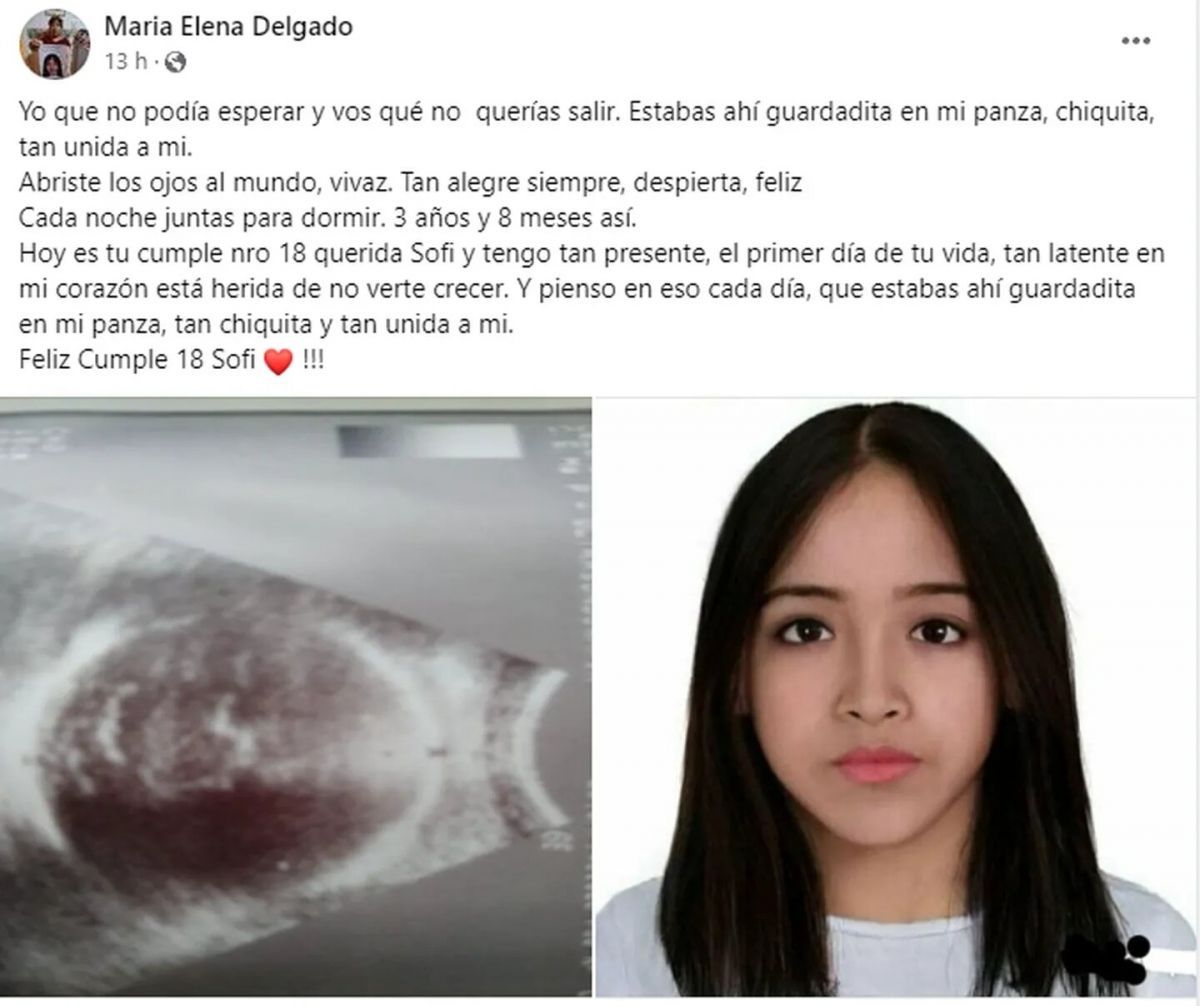 “Cada noche juntas para dormir. 3 años y 8 meses así. Hoy es tu cumple número 18, querida Sofi. Y tengo tan presente el primer día de tu vida, tan latente en mi corazón esta herida de no verte crecer. Y pienso en eso cada día, que estabas ahí guardadita en mi panza, tan chiquita y tan unida a mí. Feliz cumple 18, Sofi”, completó.