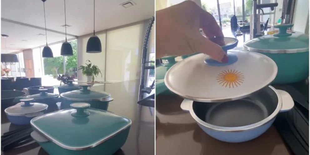 Desde su nuevo hogar, compartió una foto de su más reciente adquisición, que justo coincidió con el campeonato ganado por la Selección Argentina: un set de ollas de color verde agua, de la que se destaca una con la bandera celeste y blanca en su tapa.