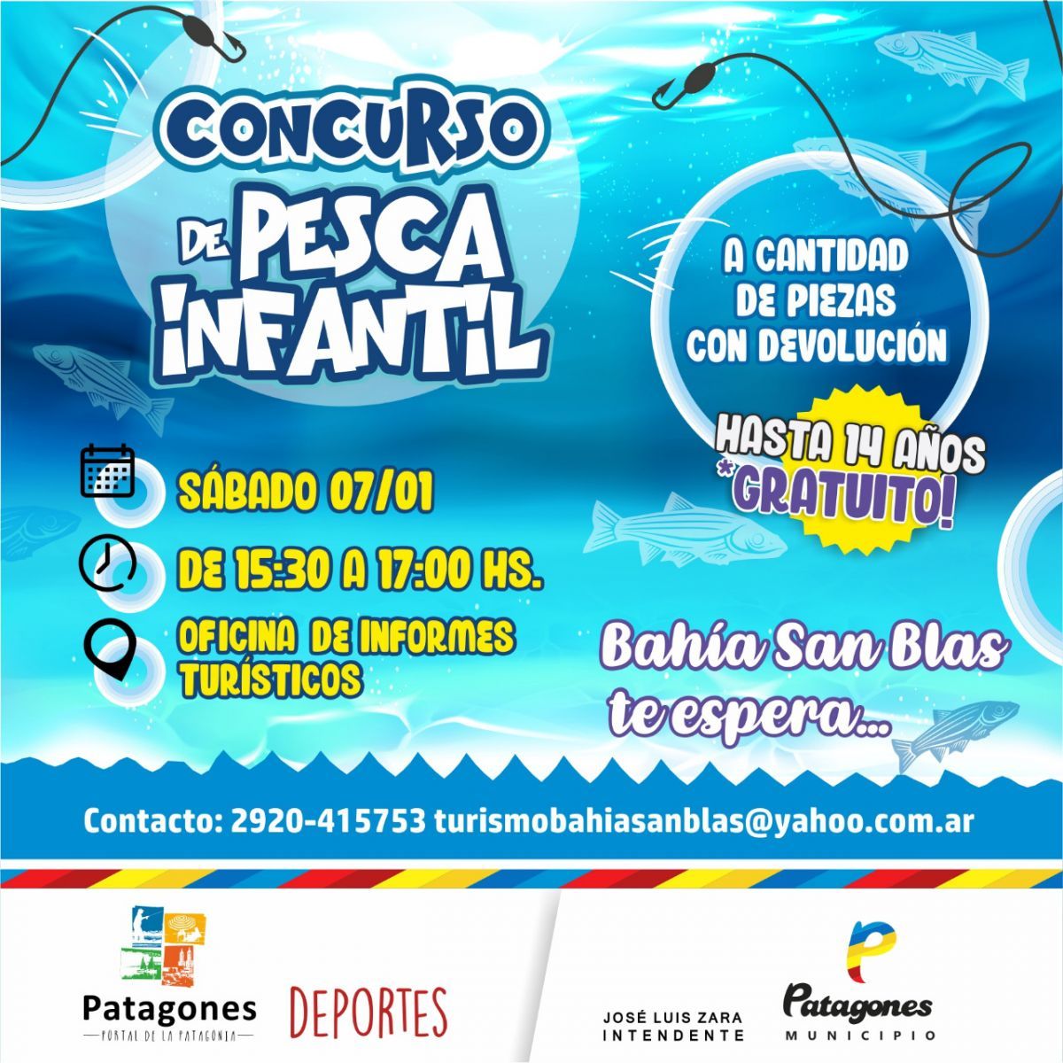Por otro lado, otra de las atracciones será el concurso de pesca infantil en Bahía San Blas. La jornada se realizará desde las 15.30 hasta las 17 y será a cantidad de piezas con devolución. La inscripción hasta los 14 años será gratuita.