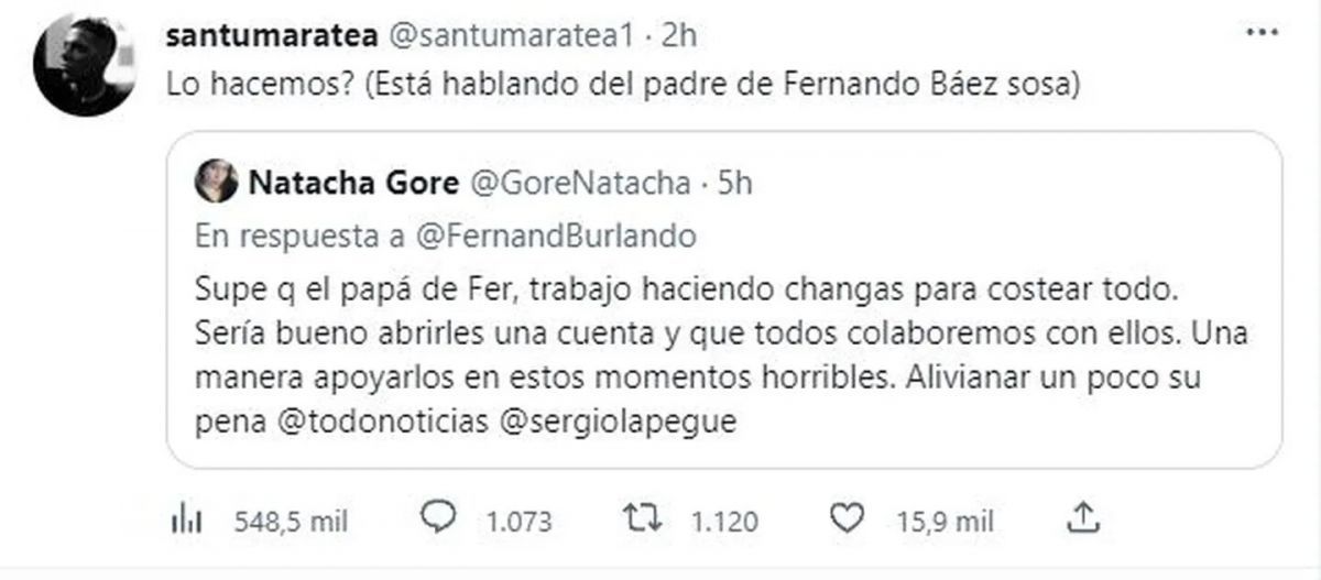Todo comenzó cuando una usuaria de Twitter llamada Natacha Gore comentó que Silvino trabajó haciendo changas para costear los gastos. “Sería bueno abrirles una cuenta y que todos colaboremos con ellos. Una manera de apoyarlos en estos momentos horribles. Alivianar un poco su pena”, escribió a modo de iniciativa.