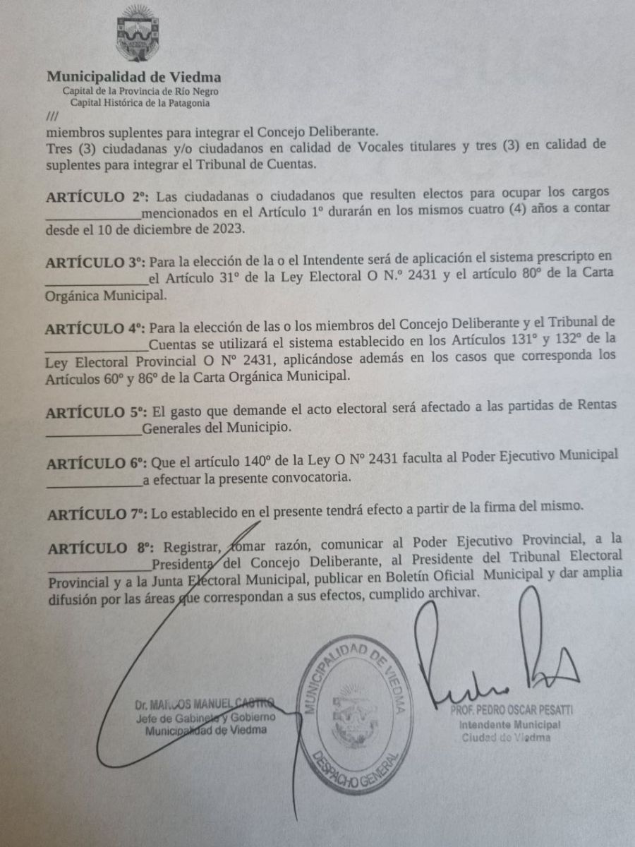 El intendente Pedro Pesatti firmó el decreto para “convocar al pueblo de Viedma para que el día 16 de abril, de forma simultáneo con las elecciones provinciales, proceda a elegir: un ciudadano para el cargo de Intendente Municipal y nueve ciudadanos para miembros titulares y nueve ciudadanos en calidad de suplentes para integrar el Concejo Deliberante”.