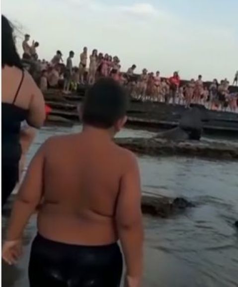 Incluso, se por la cantidad de gente, un guardavidas se acercó para ver qué pasaba y no le quedó más remedio que poner una bandera para que todo los que estaban allí entendieran que no podían acercarse. Sucede que mucho lo arreaban, cuan animal de campo, para que regresa al mar…cuando había salido para descasar.