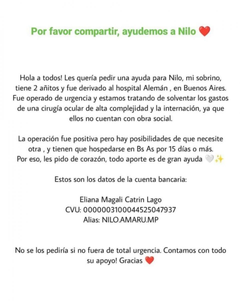A raíz de esto, hay una cuenta bancaria a disposición en MercadoPago, a nombre de Eliana Magali Catrin Lago, para aquel que pueda y quiera darles una mano económica. CVU: 0000003100044525047937 Alias: NILO.AMARU.MP