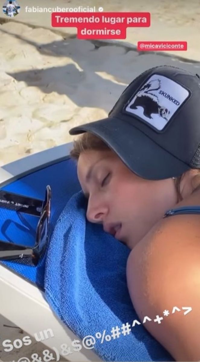 Poroto subió esta foto a sus stories de Instagram con una canción de cuna y escribió: "Tremendo lugar para dormirse". Esto sin dudas generó una rápida respuesta y reacción por parte de Mica, que se sorprendió al ver la historia de su pareja y salió a contestarle.