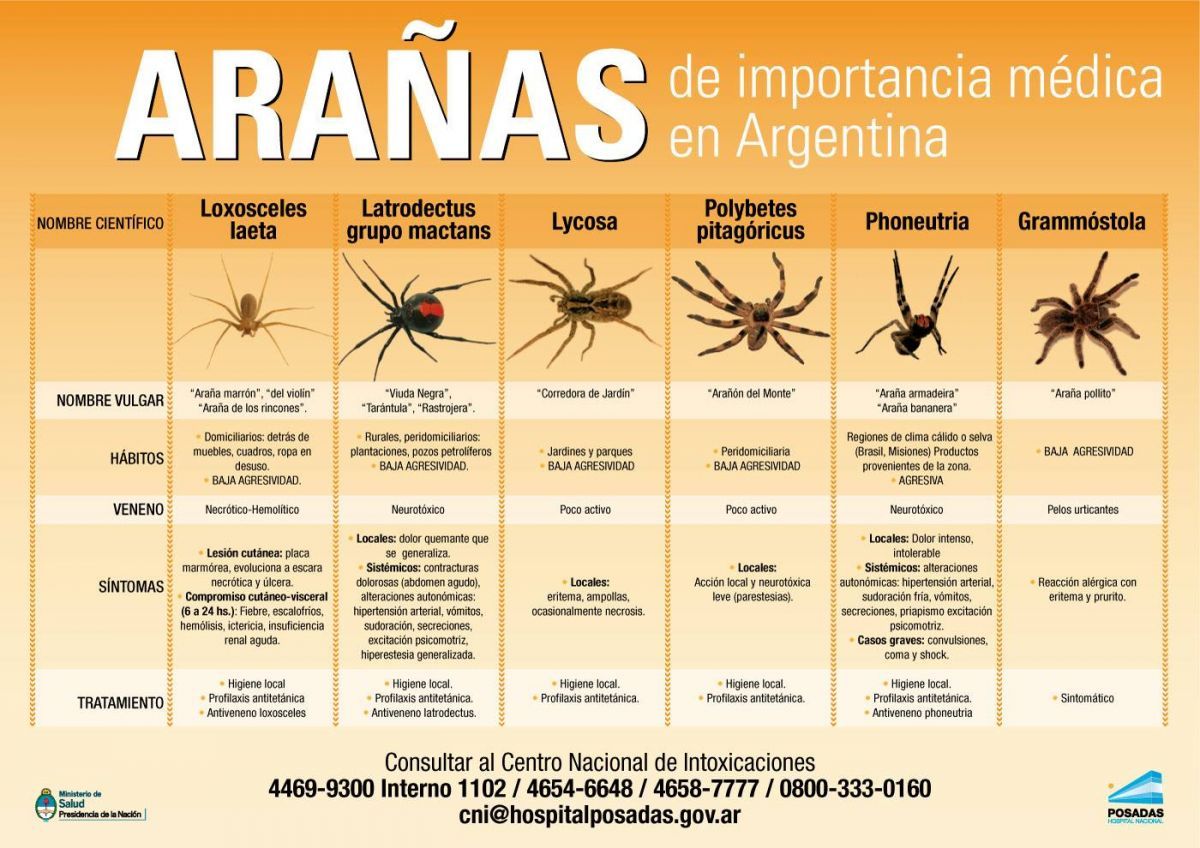 Según señaló Spicoli, “todos los años aparecen distintos tipos de arañas” y añadió que “los peligros tienen que ver con que poseen ponzoña. Todas son venenosas, pero las que tienen que preocupar son las de interés médico, que son particularmente la viuda negra y la violinista.  Las de jardín no son peligrosas, pero igual son potencialmente venenosa”.