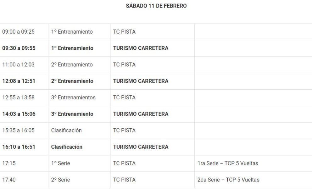 09:40     1º Serie                TURISMO CARRETERA   1ra Serie – TC 5 Vueltas