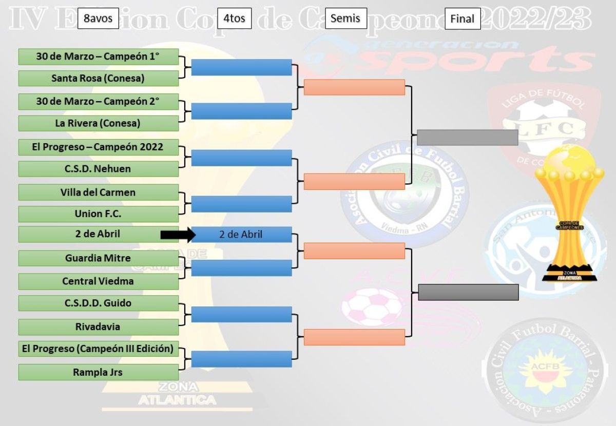 La “Copa de Campeones” reúne en un mismo torneo a los campeones de la Liga Viedmense de Fútbol, la Asociación Civil de Fútbol Barrial, la Liga Barrial de Carmen de Patagones, sumado a los campeones de las ediciones anteriores y equipos provenientes del fútbol amateur de General Conesa y Guardia Mitre.