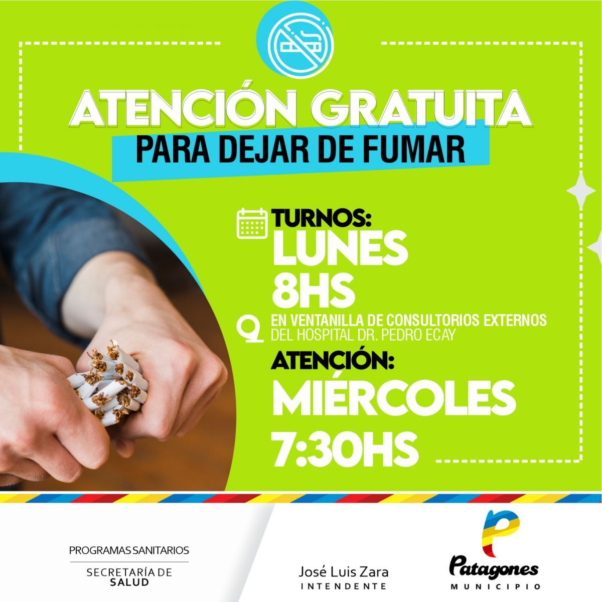 La Secretaría de Salud, a través del área de Programas Sanitarios, pone a disposición de la comunidad la atención gratuita en consultorio para asistir y ayudar a quienes se propongan dejar de fumar, no solo para prevenir afecciones de salud asociadas con el cigarrillo, sino para mejorar su salud y calidad de vida.