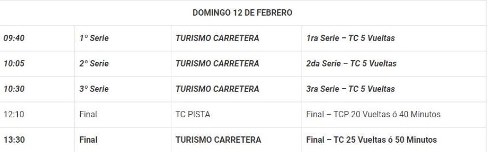 Este domingo culmina la fecha que marca la apertura de temporada del Turismo Carretera. La actividad comenzará apróximadamente a las 9.40 con la  primera serie, a las 10.05 se correrá la segunda y la tercera a las 10.30.