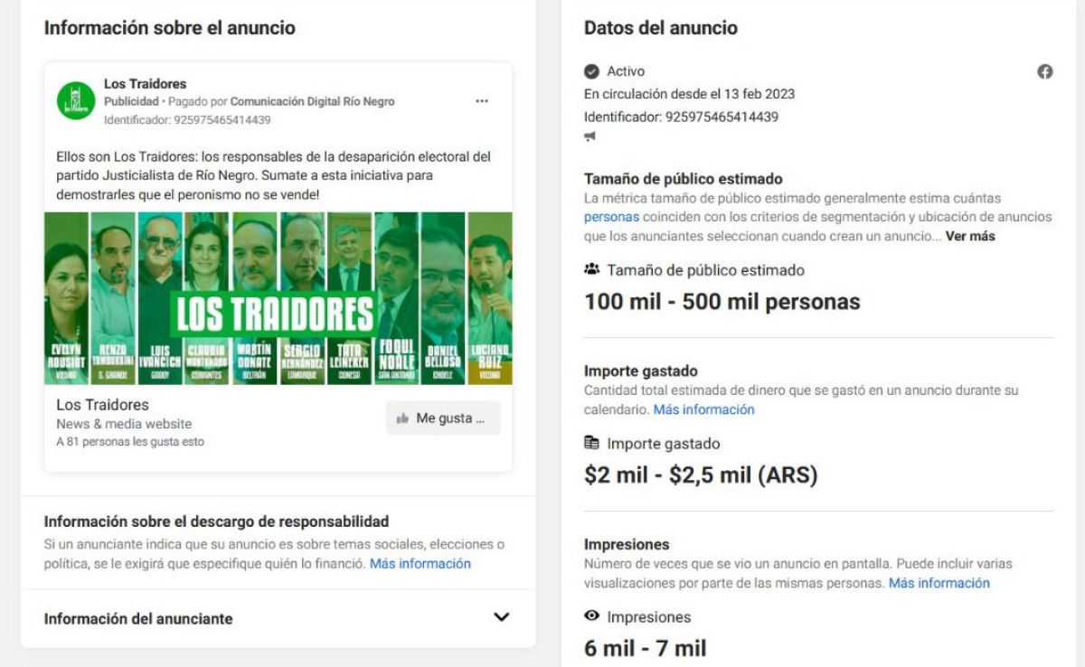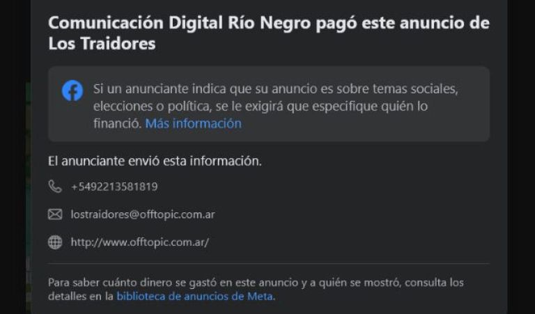 De acuerdo a una pequeña investigación, se llegó a que "Comunicación Digital Río Negro" pagó el anuncio, ya que el teléfono de quien estuvo detrás de todo es el  +5492213581819, el correo es [email protected] y la página web offtopic.com.ar.