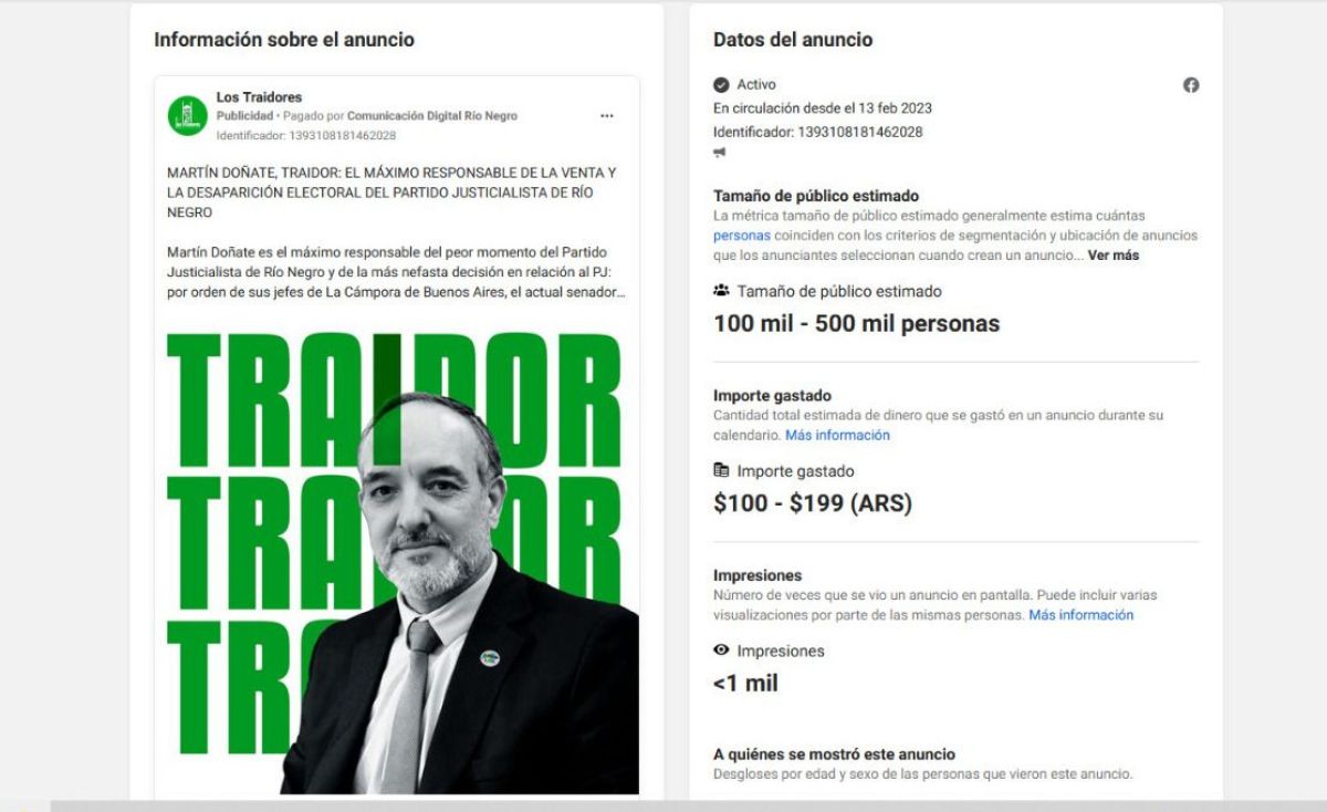 La intención de agredir a Doñate no quedó en panfletos, sino que se hizo una página de Facebook llamada "Los Traidores", con un largo mensaje donde básicamente se lo acusó al dirigente nacional de ser "el máximo responsable de la venta y la desaparición electoral del Partido Justicialista de Río Negro".