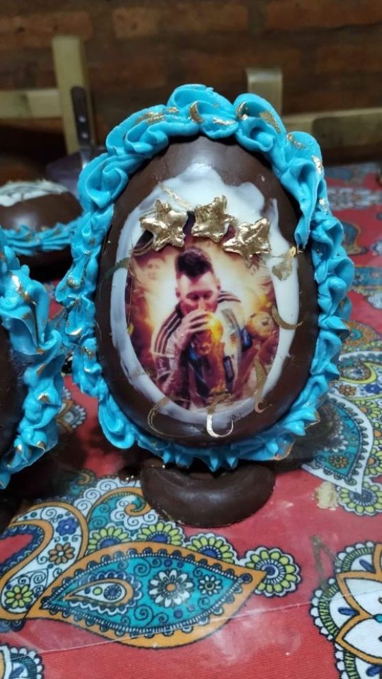 Asimismo, comentó que los diseños que más se comercializan son los huevos con los escudos de Boca y de River, con lo cual utiliza láminas comestibles, aunque también hay dibujos personalizados con dibujos animados o ídolos populares como Lionel Messi o el Dibu Martínez.