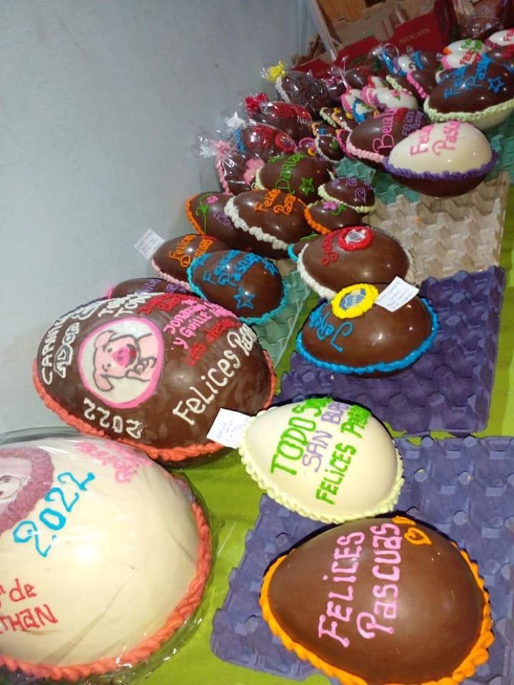 Los huevos pequeños con confites y con el detalle del nombre de cada niño cuesta $300, los medianos personalizados que son del tamaño de una lata de arvejas salen $500, los grandes con confites, bombones y caramelos del tamaño de un paquete de harina cuestan $1500 y los gigantes que son ideales para comercios, para sorteos o para regalar contienen juguetes, golosinas de marca y otros huevos adentro a $8000.