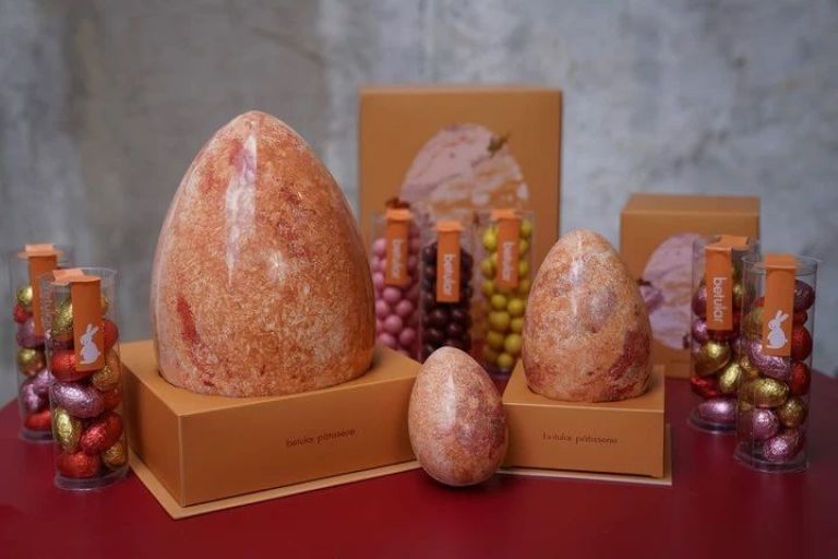 Los mismos están hechos de chocolate blanco, praline de avellanas y chocolate con leche, con un formato muy top en el que también hay que destacar que se encuentran rellenos de mini huevos de chocolate con leche, pasta de avellanas y grageas de chocolate naranja.