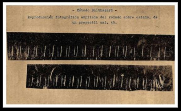 En Francia el Médico Forense Víctor Balthazard, hacia 1912, también plantea que existían marcas en los proyectiles dejadas por el arma que los disparaba y que esas marcas podían ser útiles para la identificación, crea entonces un sistema que consistía en presionar y hacer girar el proyectil “incriminado”, obtenido muchas veces de los cadáveres o de los heridos, sobre una delgada lámina de estaño la que luego era fotografiada para obtener una imagen plana de la circunferencia del proyectil, a continuación la imagen obtenida se ampliaba tres o cuatro veces para observar las minucias coincidentes con otra imagen de un proyectil “testigo” que se tomaba del arma que se sospechaba fuera la utilizada para cometer el crimen.