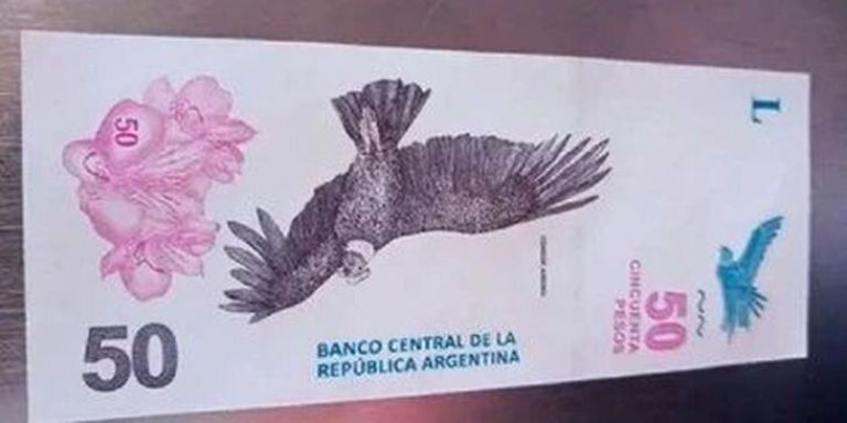 En este caso, se trata de un billete de 50 pesos argentinos emitido en 2018, que cuenta con la figura del cóndor andino. En una publicación del portal de compra venta Mercado Libre se pide una suma de $50.000 por él.