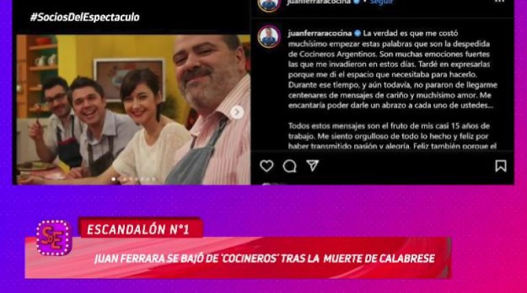 En los últimos días sorprendió la noticia que indicaba que Juan Ferrara dejaba de integrar el equipo de Cocineros Argentinos. Él lanzó un comunicado en sus redes dejando entrever que no se iba en los mejores términos. Ahora, se dio a conocer el verdadero motivo por el cual lo empujaron a irse.