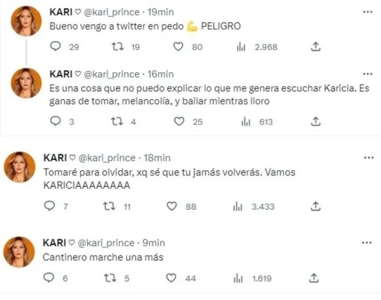 Cerca de las 19.30 horas avisó: "Bueno, vengo a Twitter en pedo. Peligro". En otro tweet, explicó los motivos. "Es una cosa que no puedo explicar lo que me genera escuchar Karicia. Es ganas de tomar, melancolía y bailar mientras lloro", detalló, dando una idea del escenario en el que se encontraba escuchando al recordado grupo de música tropical.