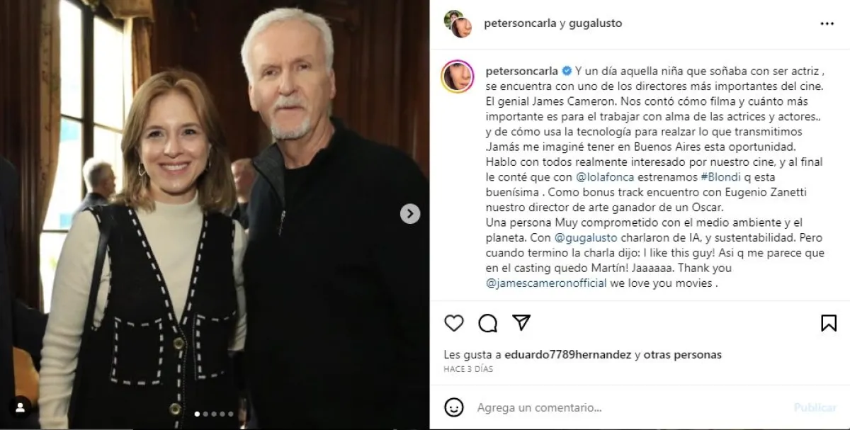 “Y un día, aquella niña que soñaba con ser actriz, se encuentra con uno de los directores más importantes del cine. El genial James Cameron”, escribió, todavía algo conmovida por el encuentro, en un posteo junto a imágenes junto a él.
