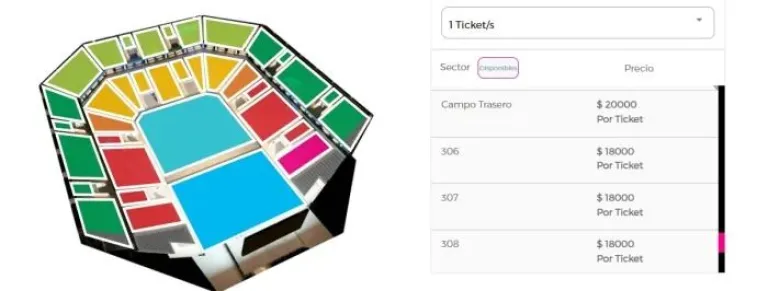 Los sectores 301 al 317 (color verde oscuro, arriba del todo) se venden a 23.000 pesos, mientras que 107 a 113 (color amarillo mostaza) se venden a 24.000.