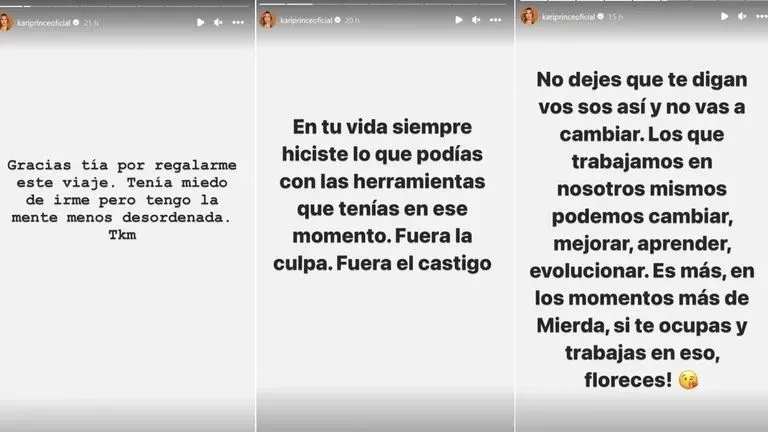 En sus publicaciones, Karina reflexionó sobre los temores que tuvo antes de realizar este viaje: "Gracias, tía, por regalarme este viaje. Tenía miedo de irme, pero ahora mi mente está menos desordenada. Te quiero mucho".