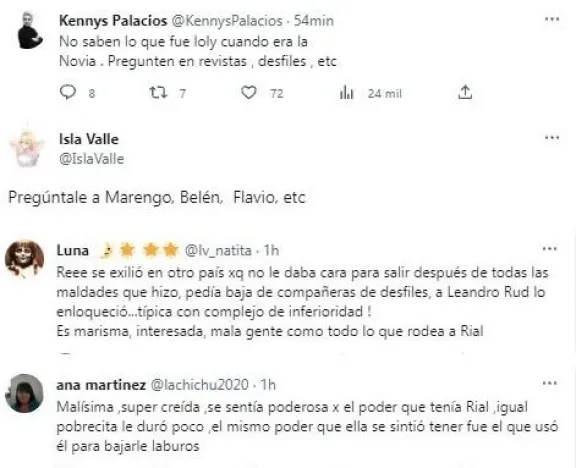 "Malísima, súper creída, se sentía poderosa por el poder que tenía Rial. Igual, pobrecita, le duró poco. El mismo poder que ella se sintió tener fue el que usó él para bajarle laburos" y "Reee. Se exilió en otro país porque no le daba cara para salir después de todas las maldades que hizo: pedía baja de compañeras de desfiles, a Leandro Rud lo enloqueció... Típica con complejo de inferioridad", fueron otros comentarios que generó el tweet del estilista.