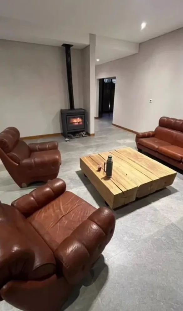 En el living, ya casi terminado, Varela colocó cómodos sillones de cuero marrón y una estufa tipo salamandra, además de una mesa ratona de madera, de estilo industrial.