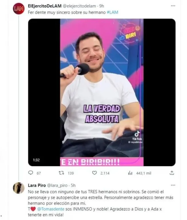 "No se lleva con ninguno de tus TRES hermanos ni sobrinos. Se comió el personaje y se autopercibe una estrella. Personalmente, agradezco tener más hermano por elección para mi. Te amo Tomás Dente, sos INMENSO y noble! Agradezco a Dios y a Ada x tenerte en mi vida!", escribió Lara, levantando aún más la interna.