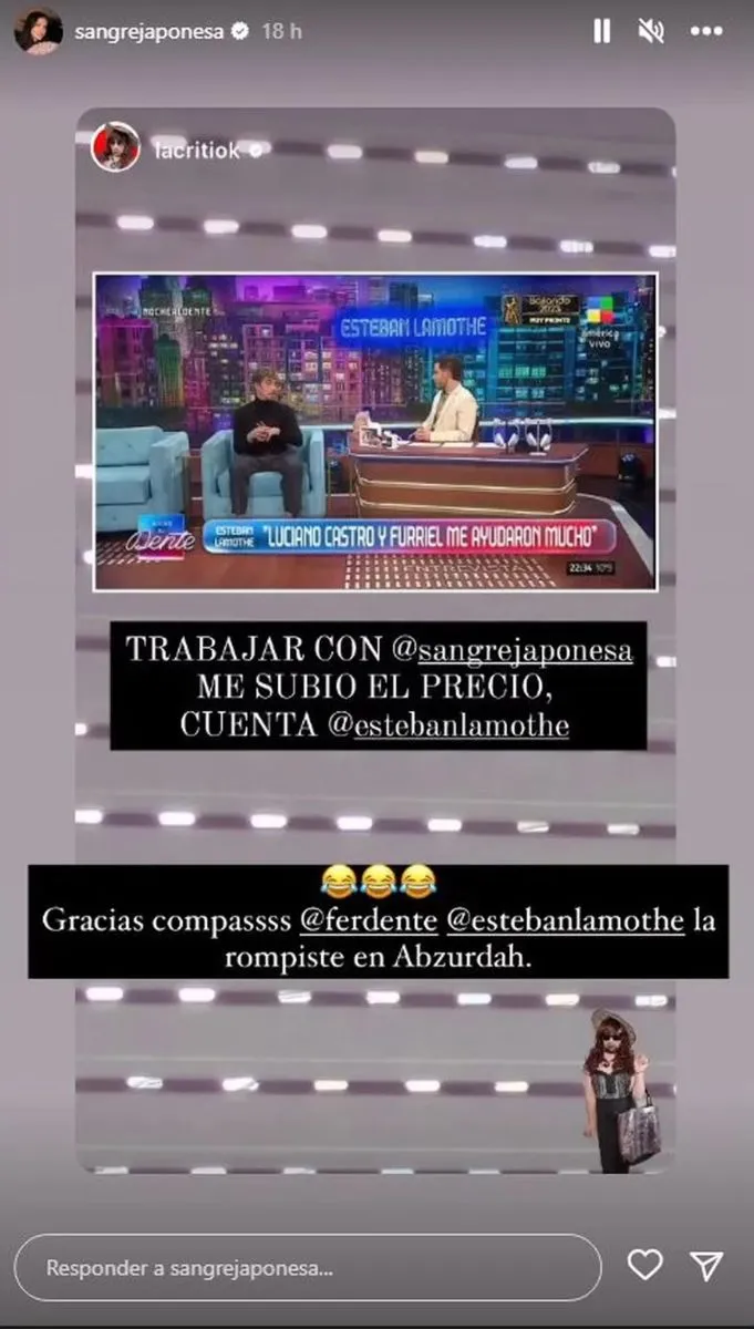 Luego de la importante repercusión que tuvieron las declaraciones de Lamothe, la China no tardó en recoger el guante y reaccionar a través de sus redes sociales. La actriz decidió enviarle un sentido mensaje de agradecimiento dirigido a su excompañero de filme.