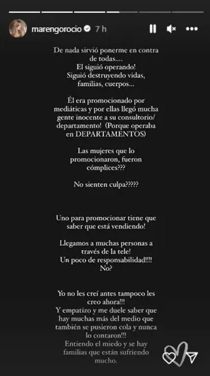 Es evidente que Rocío Marengo no ha querido quedarse callada frente a su dolor y ha decidido manifestar su descontento y enojo hacia aquellas figuras del medio que, según sus palabras, fueron cómplices del cuestionado cirujano.