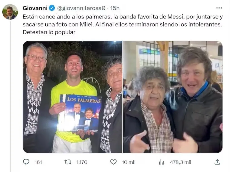 “Están cancelando a Los Palmeras, la banda favorita de Lionel Messi, por juntarse y sacarse una foto con Milei”, “Esto me arruinó el día”, “Me parece una estupidez que cancelen a Milei por sacarse una foto con Los Palmeras”, “Milei tiene que festejar el triunfo con ‘Bombón asesino’ de fondo” y más fueron algunos de los hilarantes comentarios.