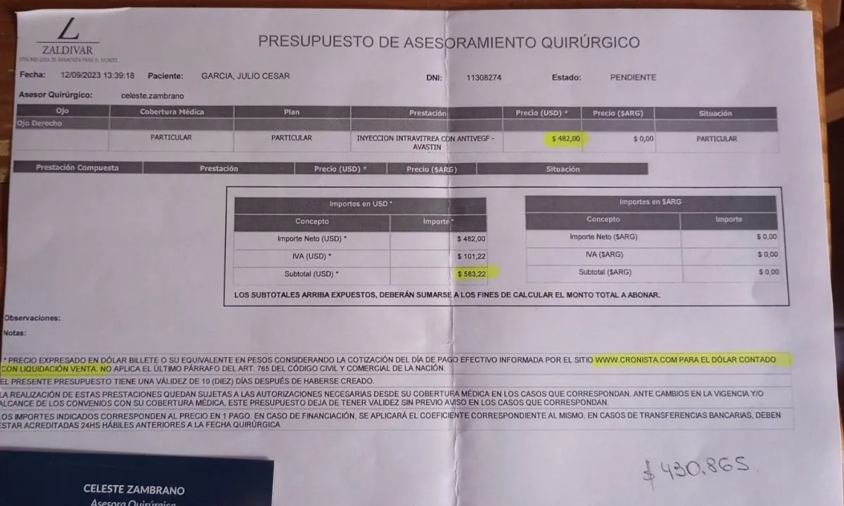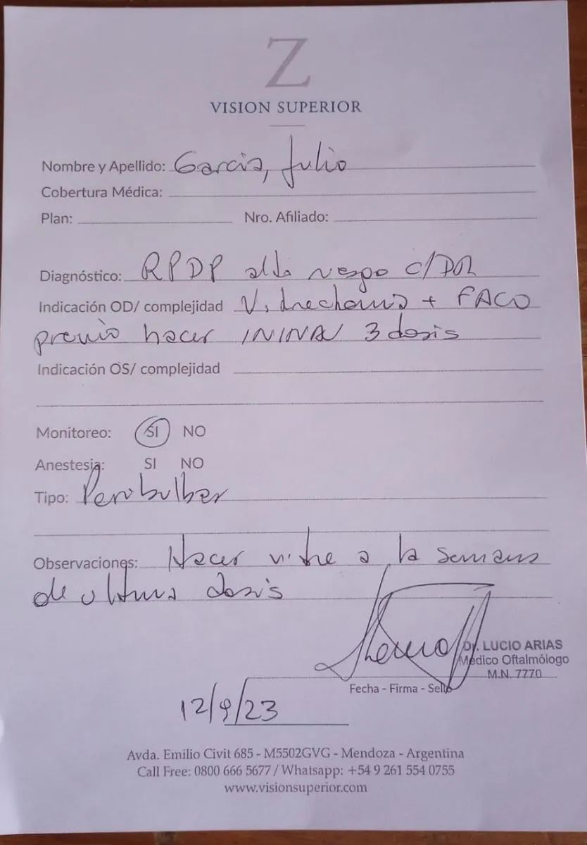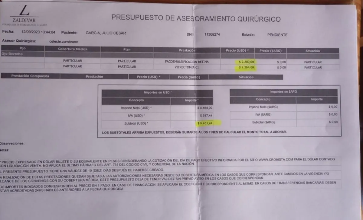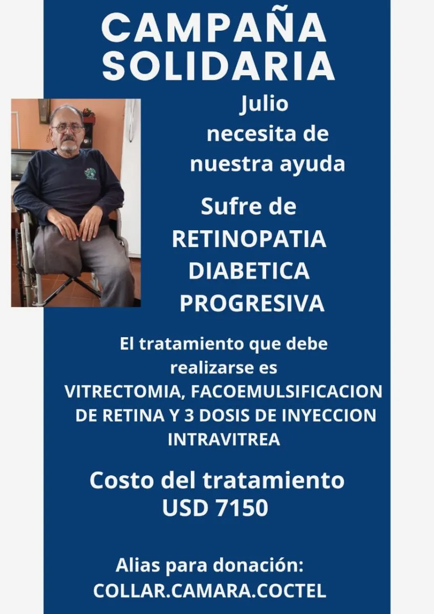 Julio tiene retinopatía diabética progresiva. NoticiasNet habló con su esposa, que explicó: “El tratamiento consiste en 3 etapas. Primero, una inyección intravítrea, al mes otra, al tercer mes otra y a la semana la operación. Cada inyección sale 583 dólares y la operación 5400 dólares”.