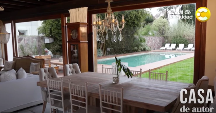 Mientras recorrían la casa, Carolina mostró el impecable interior con grandes ventanales que permiten disfrutar de la vista al jardín y a la piscina. En las paredes, destacan las piedras y una decoración retro, con un reloj de pie y una impresionante araña colgante.