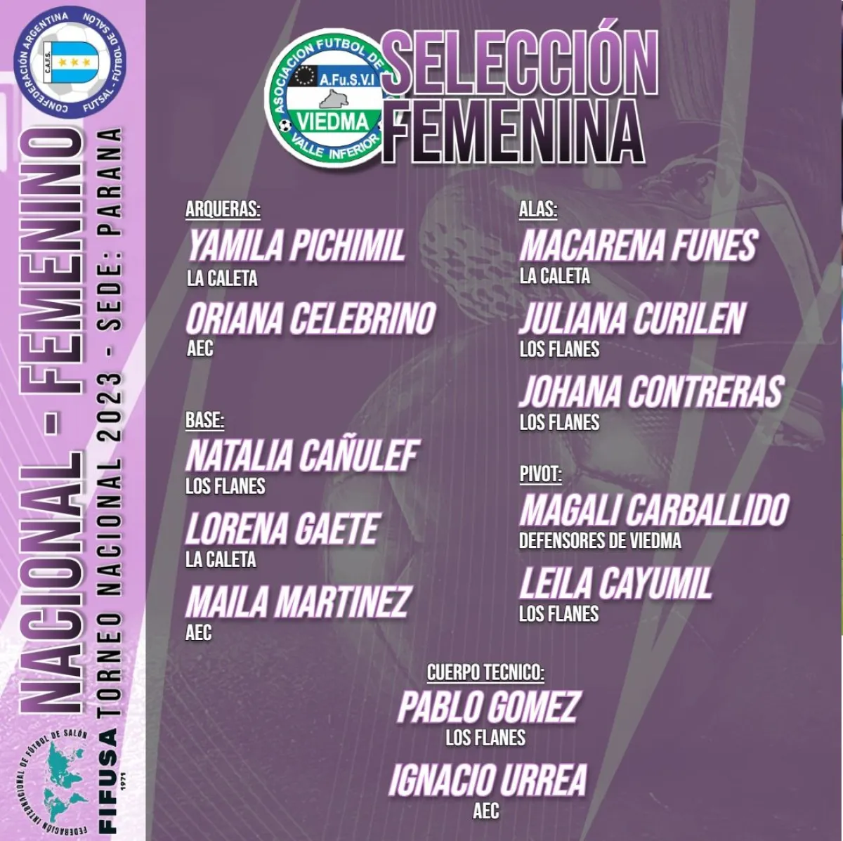 Este domingo a las 21, el plantel de la Selección Femenina de la Asociación de Fútbol de Salón Valle Inferior (AFUSVI) partirá rumbo a Paraná, Entre Ríos, para disputar el Torneo Nacional de Selecciones. El equipo dirigido por Pablo Gómez e Ignacio Urrea ultima detalles de cara al certamen.
